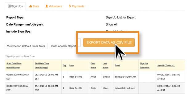 • Choose "List of Sign Ups for Export to Excel" to export a list of all slots (both "open" and "filled") along with name and contact information for slots that are currently filled. On the next page you can customize if you want to see this list with or without the blank slots.