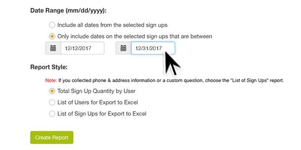 Next, scroll to the bottom of the page to add date parameters. Choose to "Include all dates from the selected sign ups" or customize the start and end dates. Under Report Style, you have the choice to create reports in a number of ways.